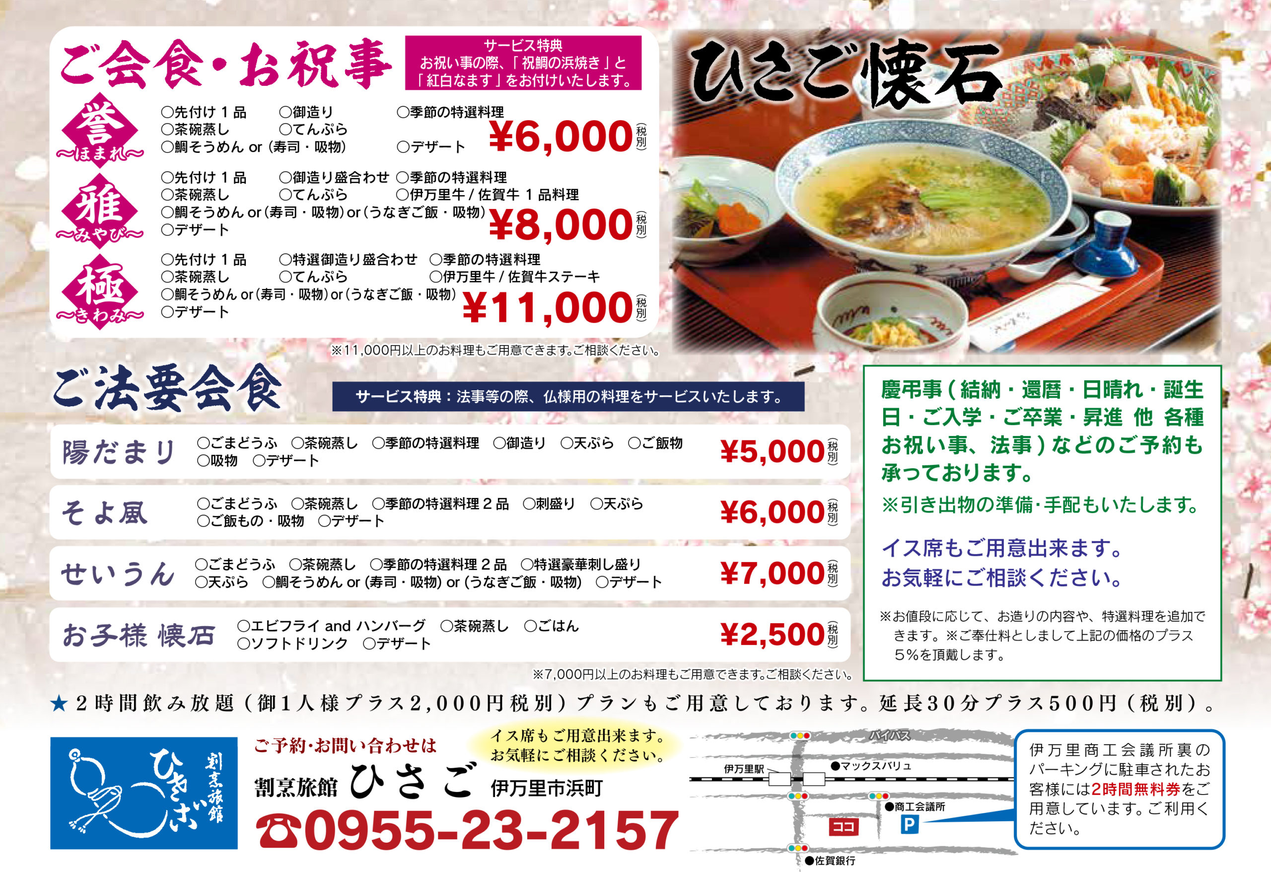 先付け1品・御造り盛り合わせ・季節の特選料理・茶碗蒸し・伊万里牛/佐賀牛1品料理・てんぷら・鯛そうめん(or 寿司・吸物)・デザート